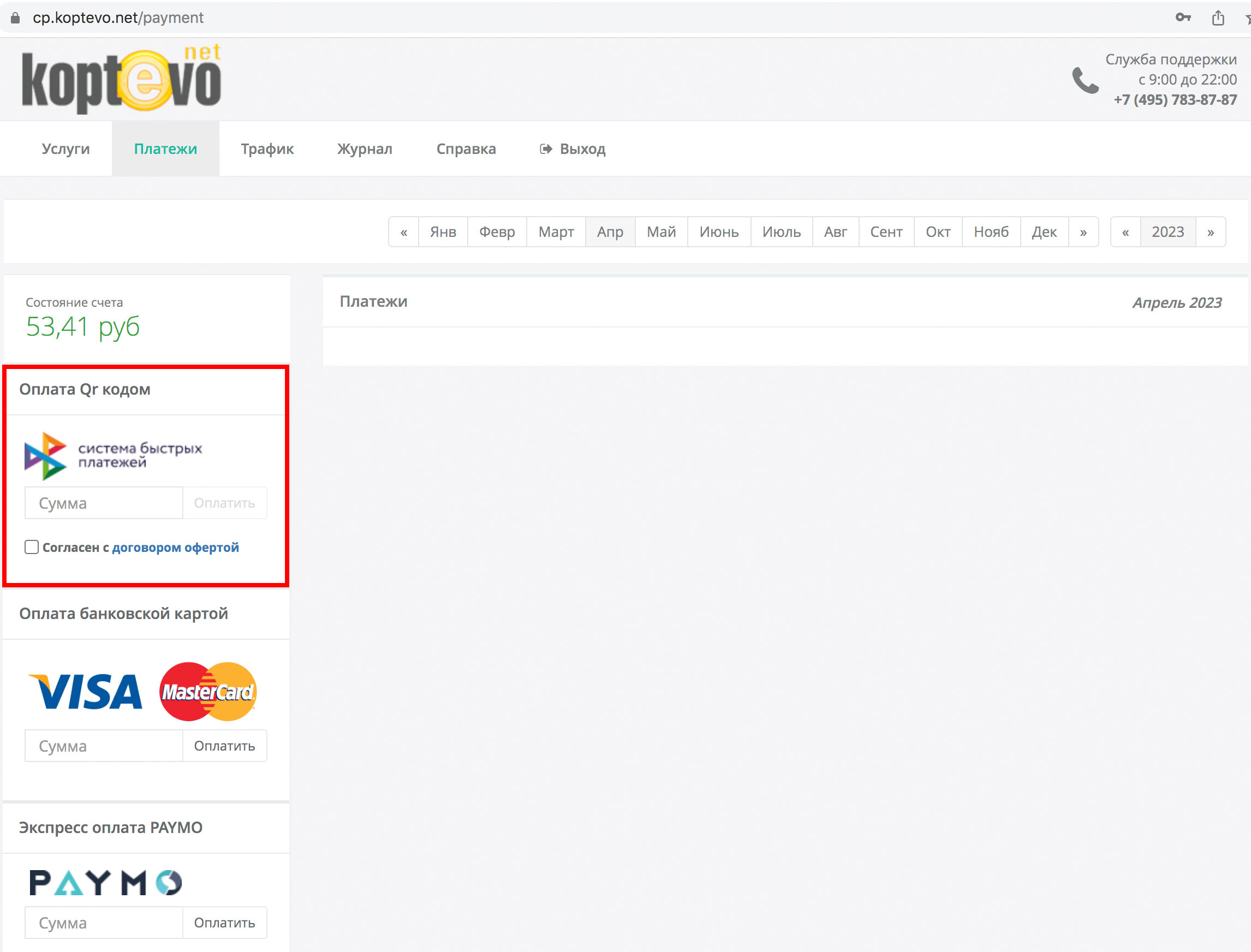 Выбрать пункт меню «Платежи». Слева расположена графа оплата QR-кодом и логотип Система быстрых платежей. Где поле "сумма" введите сумму платежа, далее рядом нажмите на кнопку "Оплатить". Необходимо установить галочку о согласии с офертой.